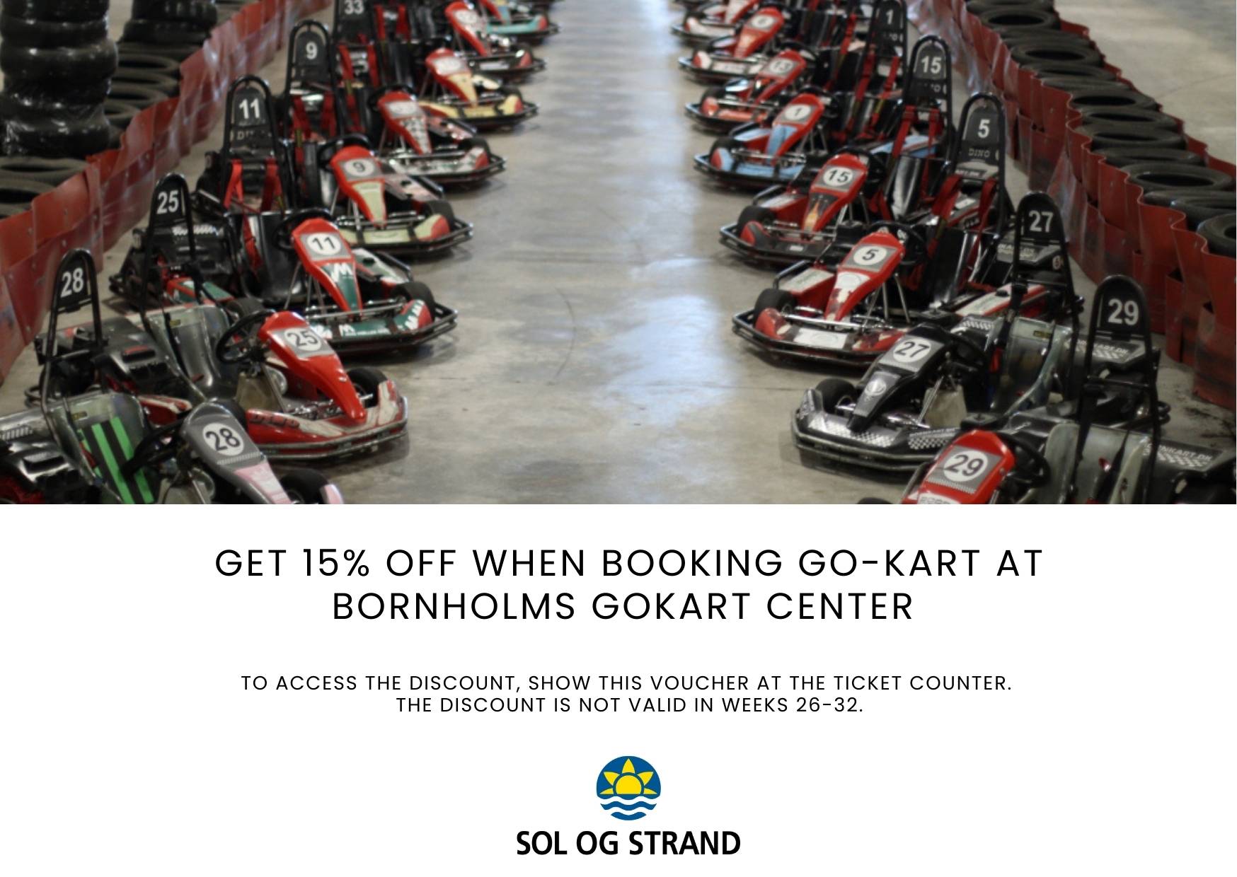 Som semester gäst hos Sol og Strand får du 15 % när du bokar gokart på Bornholms Gokart Center. Ta med denna voucher och visa den tillsammans med ditt Sol og Strand hyresbevis för att få rabatten.